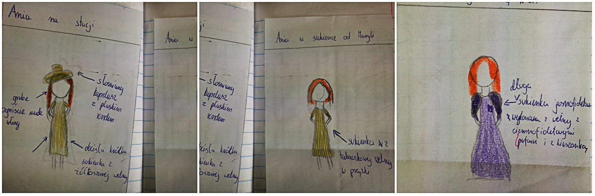 Zanim jednak uczniowie zredagowali opisy, mieli do wykonania całkiem przyjemne zadanie: kolejną notatkę graficzną. Musieli wyszukać w książce opis Ani na stacji oraz opis trzech sukienek, które dla dziewczynki uszyła Maryla, narysować bohaterkę (nawet schematycznie) i podpisać strój, posługując się sformułowaniami z powieści. Ponadto uczniowie mieli stworzyć dla Ani jej wymarzoną kreację - sukienkę z bufiastymi rękawami. Ważna informacja: zadałam uczniom tylko 16 pierwszych rozdziałów powieści, więc większość* z nich nie wiedziała nic o brązowej sukience, którą Ania dostała od Mateusza na Boże Narodzenie.