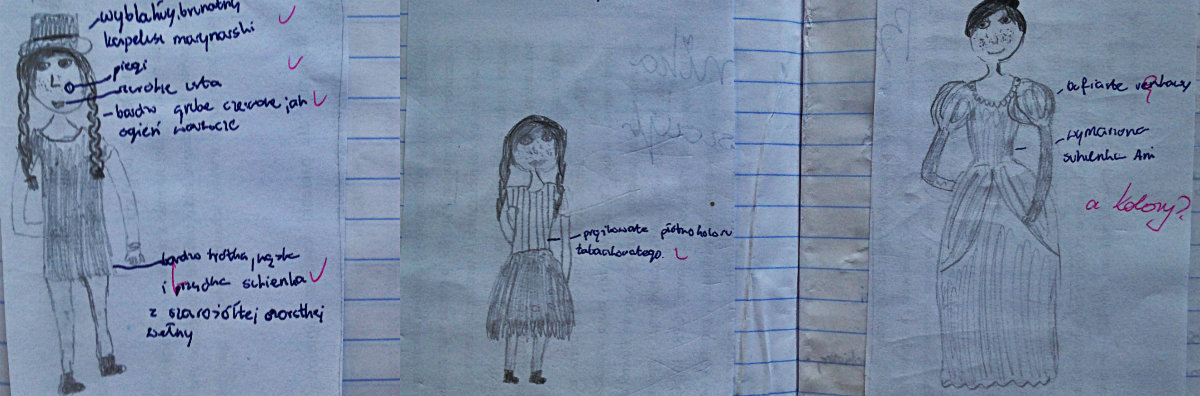 Ukryty przed uczniami, ale dla nauczycieli wyraźny jest cel wychowawczy tego zadania. Oprócz sprawdzenia, czy uczniowie opanowali daną formę wypowiedzi, chciałam sprawdzić, na ile silny w klasie jest stereotyp dziecka wychowującego się w domu dziecka. Czy moi uczniowie postrzegają dzieci niemieszkające w rodzinach jako gorzej wyglądające? Zaniedbane? Inne? To ćwiczenie redakcyjne pozwoliło mi płynnie przejść do następnej lekcji. Na szczęście okazało się także, że większość uczniów w swoich opisach wyraziła pogląd, że gdyby Ania żyła współcześnie wyglądałaby tak jak oni i marzyła o takich samych ciuchach. Warto dodać, że niektórzy chłopcy mieli problem z wymyśleniem tego, o jakich ubraniach marzą dziewczynki. Pomoc koleżanek okazała się nieoceniona ;).