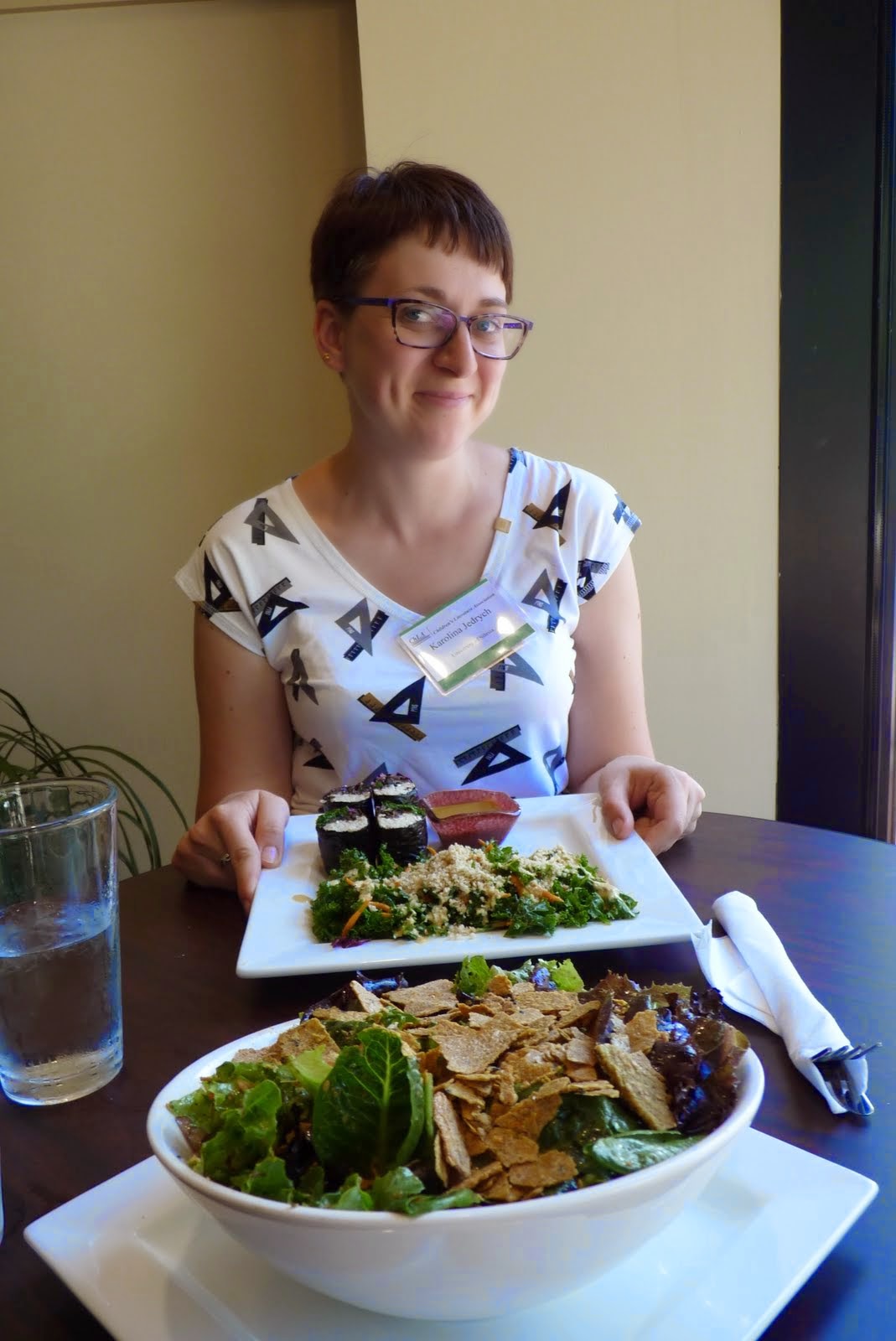 Sceptycyzm wyparował po pierwszym kęsie sałaty. Jak to możliwe, żeby sałata była tak dobra? WOW. No i jeszcze kalafiorowy ryż w czymś, co udawało sushi. Pyszny! Do dziś zastanawiam się, czemu ja tam deseru nie zamówiłam. Czemu?! (Dodam, że ceny były podobne do tych w większości knajp w okolicy. Zwykle za lunch płaciłam ok. 15 dolarów.)