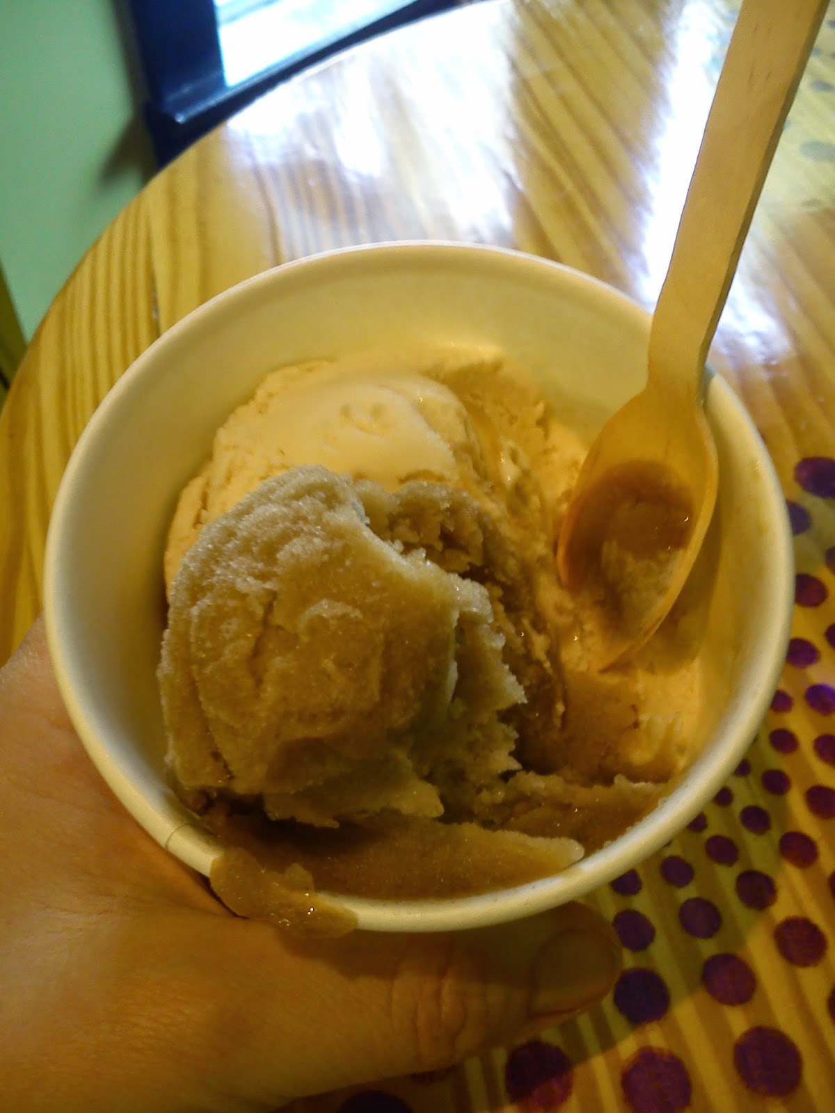 No, dobra, a teraz pozytywy będą :). Jeśli będziecie kiedyś w Columbii SC, zajdźcie na Soda City Market, o którym pisałam już w poprzednim poście oraz do dwóch lokali. Jeśli nie macie nic przeciwko deserom przed obiadem (ja nie mam!), to wstąpcie najpierw na lody do Paradise Ice. To niewielka lodziarnia prowadzona przez małżeństwo, które samo kręci wszystkie lody, a nawet wymyśla własne smaki! Regułą jest też to, że jakiś smak pojawia się, a potem znika, bo zastępuje go inny. Wiem to, bo wypytałam właściciela :). Wafelki do lodów również wypiekane są na miejscu.
